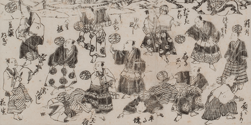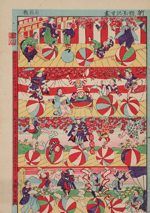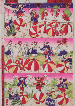 団扇絵とよばれる浮世絵版画。その名のとおり、団扇の骨に貼って団扇として使用されました。
