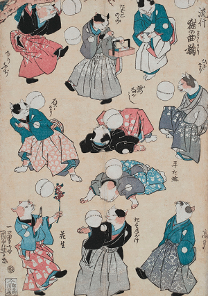 いかに対象を観察し、描くか。そしてアイデアをどのように膨《ふく》らませ、形にしていくか。「百面相《ひゃくめんそう》」で培《つちか》われた画才は、そのまま猫の戯画《ぎが》にも結実しています。国芳の観察力や的確な表現力とともに、次から次へとあふれでるユーモラスなアイデアをお楽しみください。