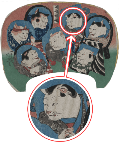 天保12年(1841)、歌川国芳《うたがわくによし》による団扇絵《うちわえ》「猫の百面相《ひゃくめんそう》」が流行します。猫を人のように描くのではなく、実在する人間の歌舞伎役者を猫に見立てて描くという趣向は、これまでにない新機軸でした。こちらは「もしも、あの有名人が猫になったら?」というアイデアが起点になったものといえるでしょう。